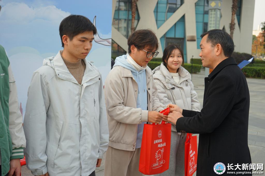 党委副书记敖廷华代表学校,亲手为10名考研学生送上寓意“能量满格”的轻松考研明白卡、暖手宝、“金榜题名”口罩等慰问品。