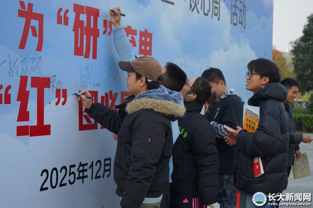 来到签名墙前,在场师生纷纷落笔,留下美好祝福和考研心愿。“研途花开,一研为定”“冬至福至,祝你‘研’途温暖”……笔墨之间,是深深的期许,更是温暖的陪伴。