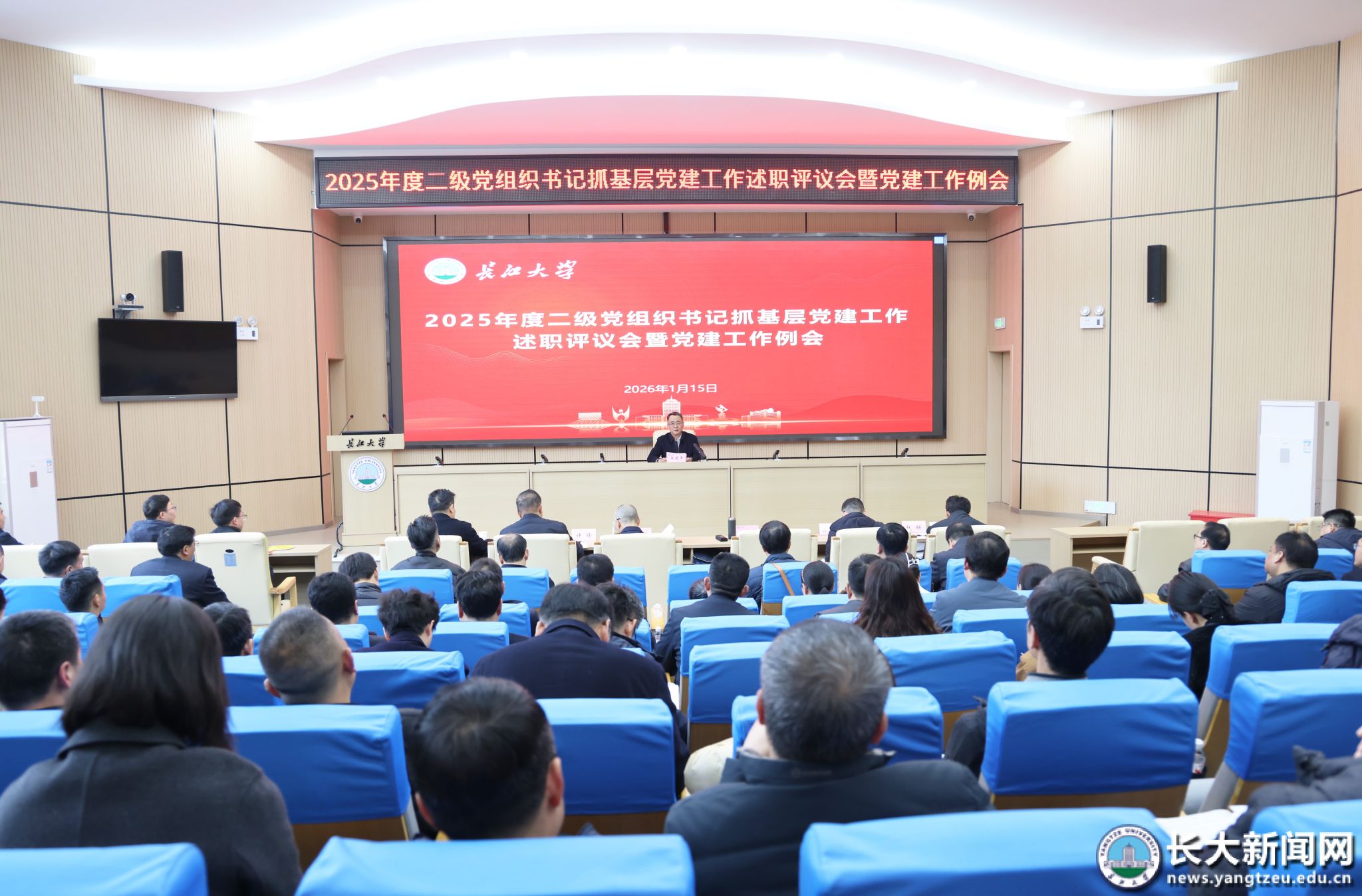 新闻网讯(通讯员 向如/文 记者 刘健/摄)1月15日下午,学校2025年度二级党组织书记抓基层党建工作述职评议会暨党建工作例会在石油报告厅召开。党委书记王建平主持会议并强调,要深入学习贯彻习近平总书记关于党的建设的重要思想,牢固树立大抓基层的鲜明导向,持之以恒抓基层、打基础、固根基,切实以高质量党建引领高质量发展,为学校“双一流”建设提供坚强政治保证和组织保障。
