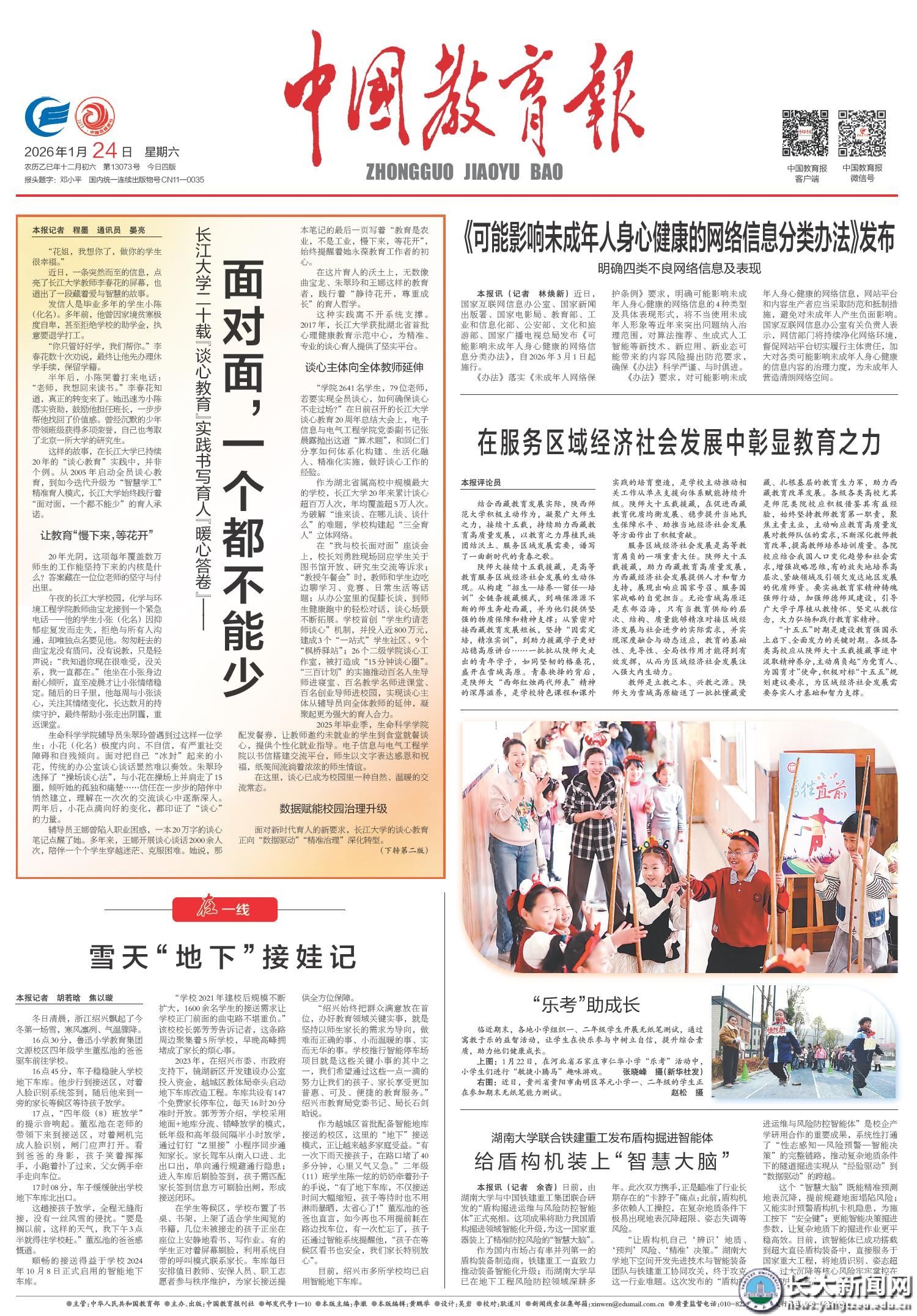 新闻网讯 1月24日,《中国教育报》头版头条以深度报道形式,聚焦我校开展谈心教育二十年育人工作,系统展现学校“面对面,一个都不能少”的育人实践与典型经验。