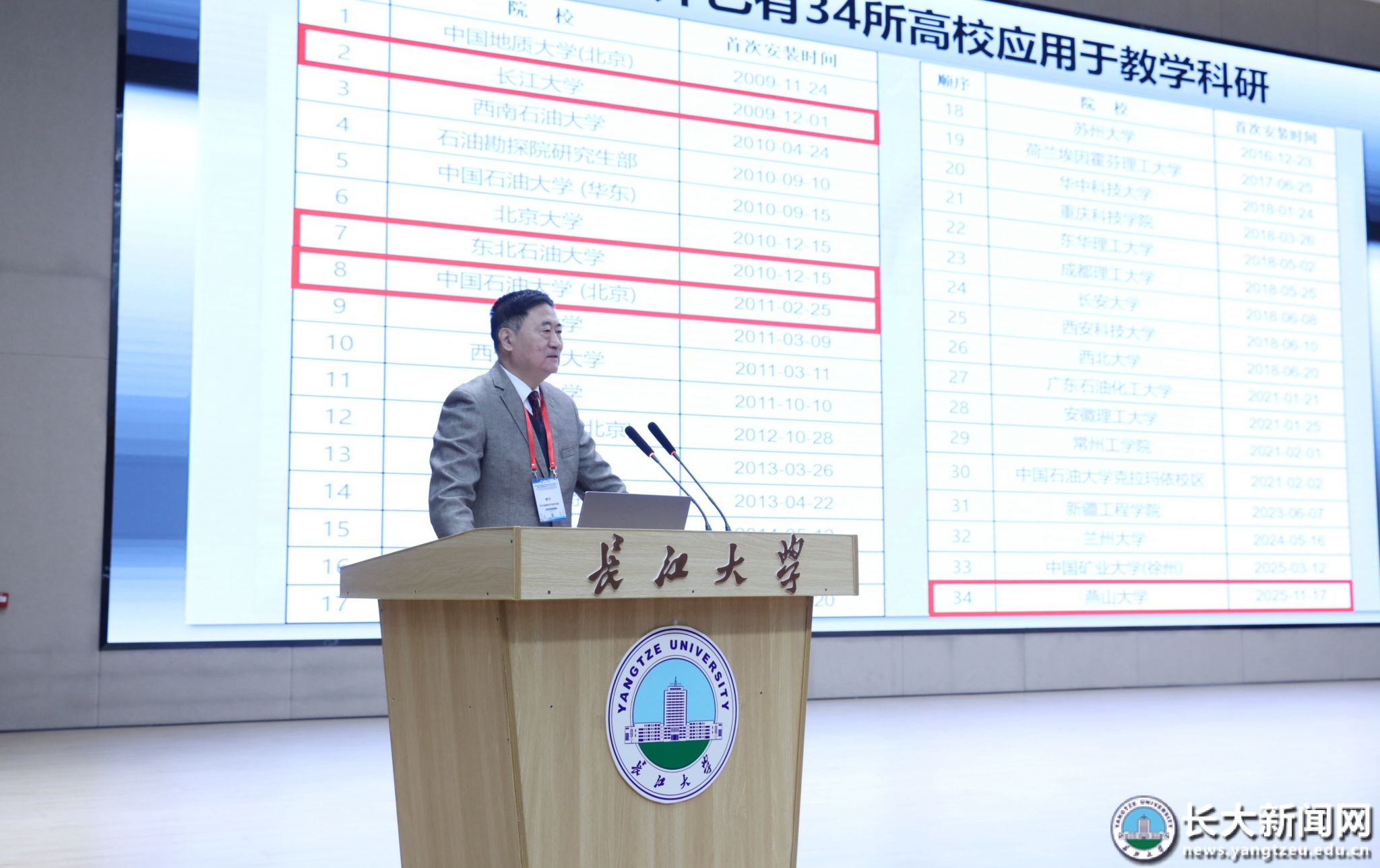 中国石油勘探开发研究院李宁院士作了题为“CIFLog-首个支持国产CPU、操作系统和数据库的大型测井工业处理软件”的报告,系统介绍了该软件在实现国产化适配、突破关键技术等方面的重大进展。在热烈的掌声中,李宁院士向学校捐赠了“CIFLog”测井工业处理软件。