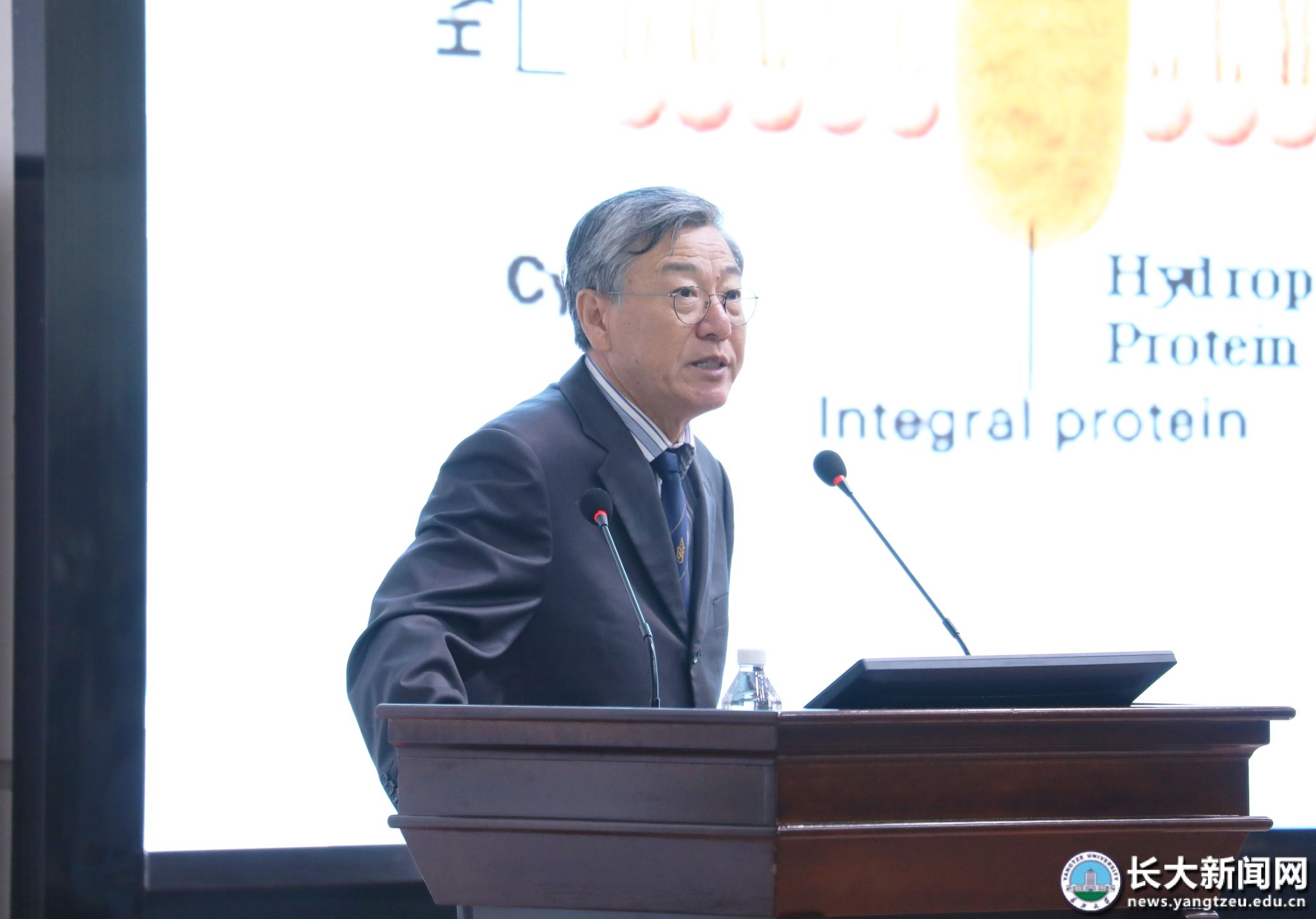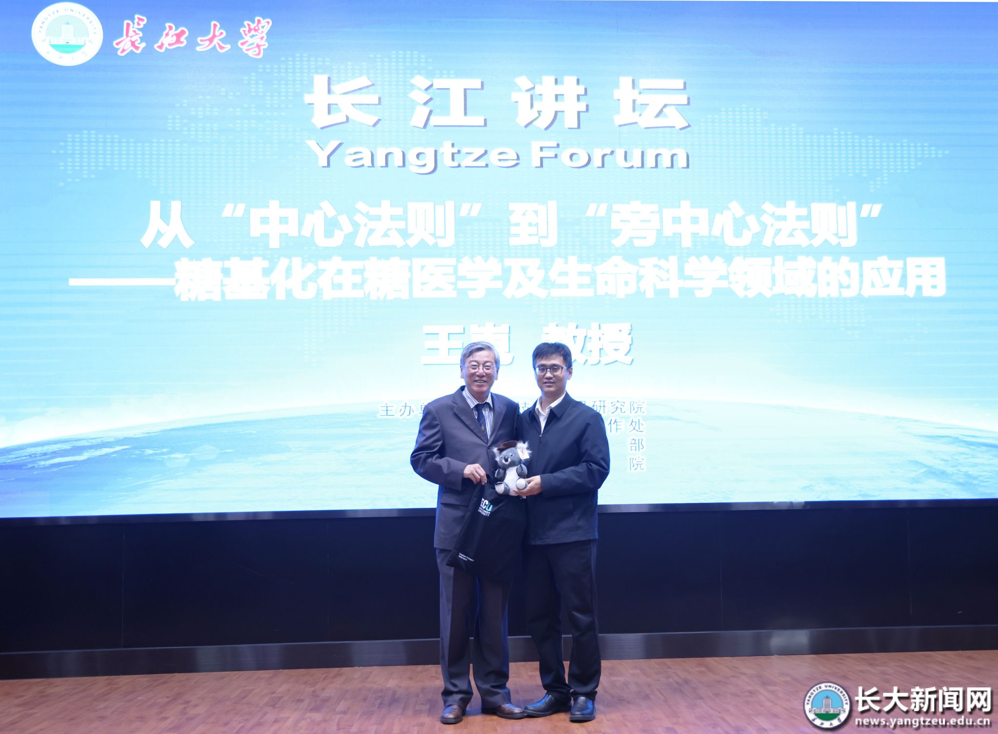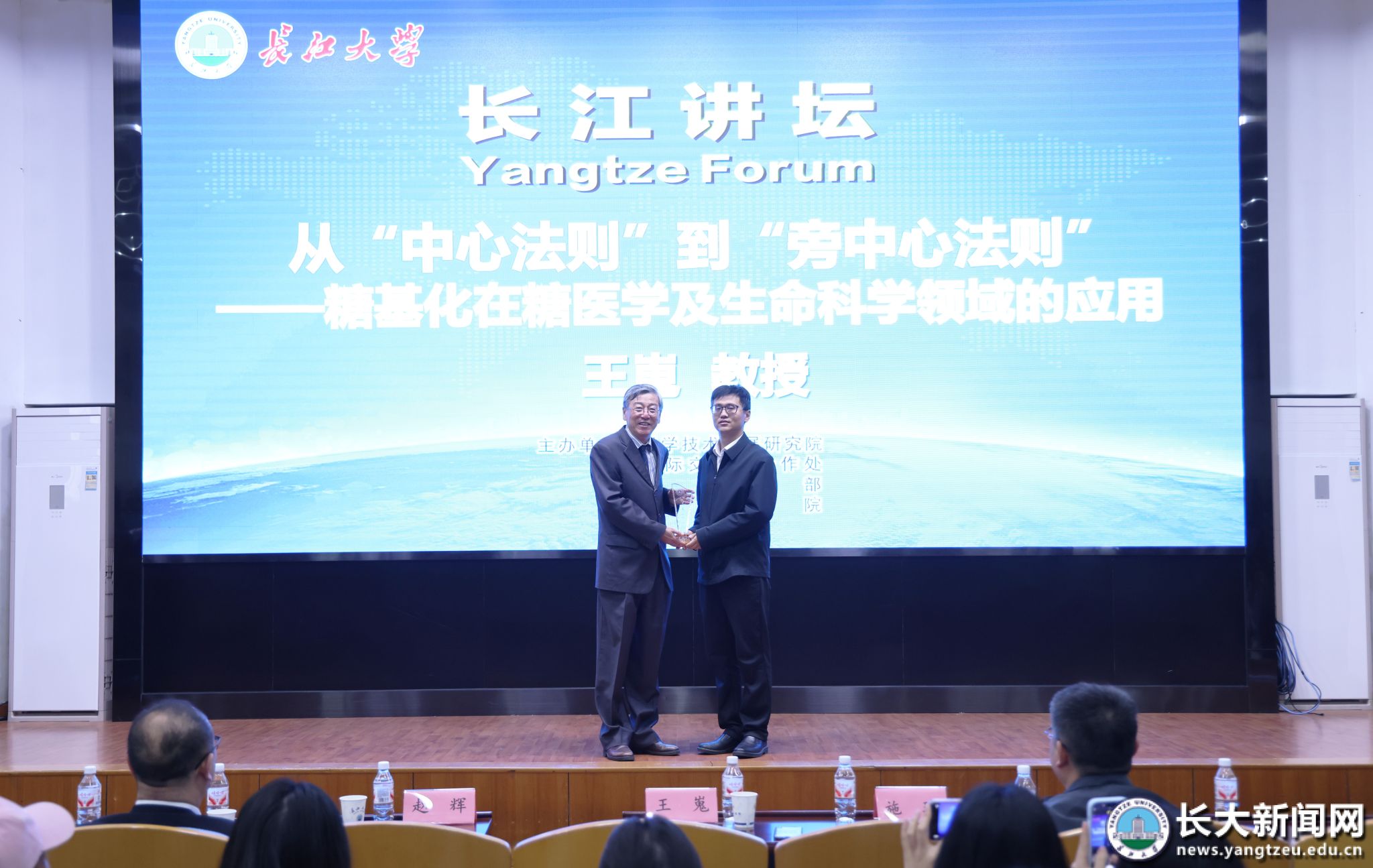 新闻网讯(通讯员 张静 邹小停 记者 刘健/摄)3月30日上午,世界杰出华人医师霍英东奖获得者、澳大利亚伊迪斯科文大学原副校长、英国皇家医学院院士王嵬教授应邀做客“长江讲坛”第88讲,在东校区求实报告厅为师生带来题为“从“中心法则”到“旁中心法则”——糖基化在糖医学及生命科学领域的应用”的学术报告。副校长赵辉出席报告会。国际交流与合作处负责人,医学部、附属荆州医院、附属第一医院及相关学院300余名师生共同聆听了报告。