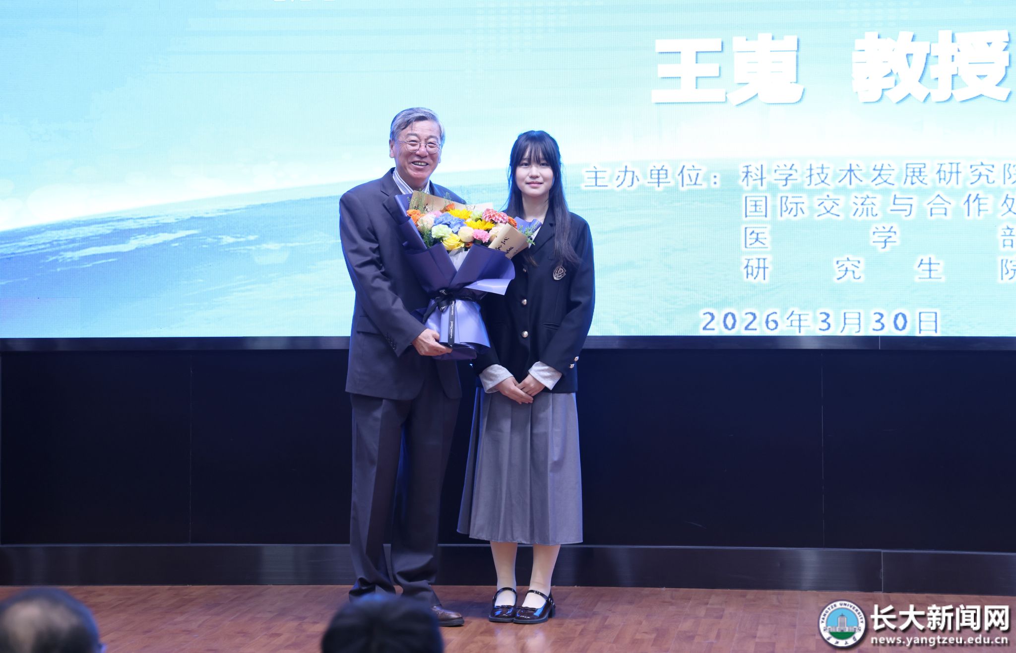 报告结束后,学生代表献上鲜花,赵辉向王嵬教授赠予了“长江讲坛”杯,王嵬教授向赵辉赠予了吉祥物。医学部常务副部长陈晓光介绍了双方学术交流与科研合作情况。