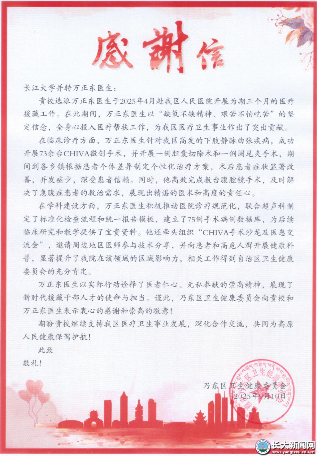 据了解,今年9月,万正东教授被乃东区人民政府授予“优秀外科援藏工作者”荣誉称号,并收到了乃东区卫健委发来的感谢信。信中,乃东区卫健委对万正东教授团队援藏期间在临床诊疗、学科建设等方面所做的突出贡献表示感谢,希望长江大学继续支持乃东区医疗卫生事业发展,深化合作交流,共同为高原人民健康保驾护航。(医学部供稿)