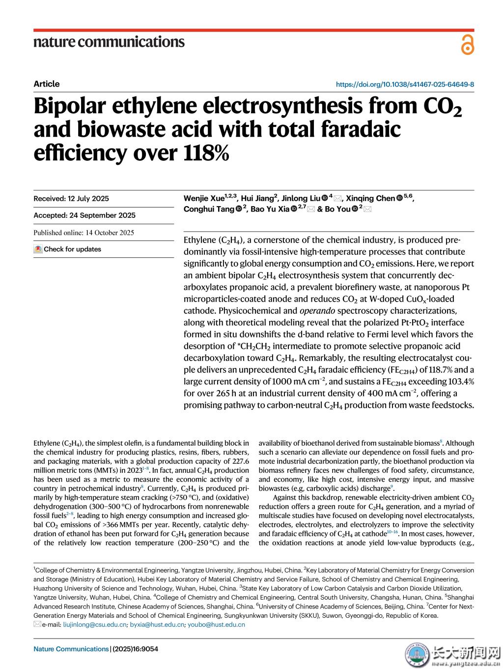 新闻网讯 10月14日,我校化学与环境工程学院薛文杰博士在《Nature Communications》期刊发表题为“Bipolar ethylene electrosynthesis from CO2 and biowaste acid with total faradaic efficiency over 118%”的研究论文。该论文介绍了一种新型双极电合成系统,可同步将CO2和生物质废弃物丙酸高效转化为高附加值乙烯。该论文第一作者为薛文杰博士,第一署名单位为长江大学。