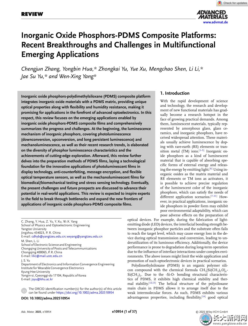 新闻网讯 近日,我校物理与光电工程学院杨文星教授团队在物理学与材料科学领域期刊《Advanced Materials》(中科院1区Top,影响因子26.8)上发表题为“Inorganic Oxide Phosphors-PDMS Composite Platforms: Recent Breakthroughs and Challenges in Multifunctional Emerging Applications”的高水平综述论文,系统总结了无机氧化物荧光粉与聚二甲基硅氧烷(PDMS)基体复合的制备工艺与关键技术环节,为高性能复合薄膜的开发与应用提供了重要见解。