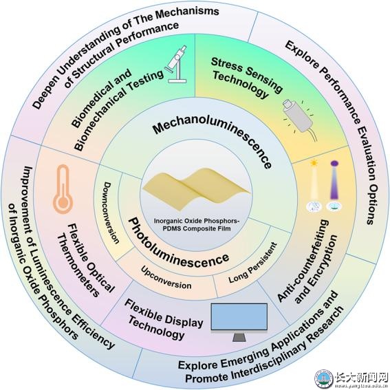 据论文介绍,该类复合平台凭借其柔韧性、化学稳定性和共形集成能力等独特优势,在柔性显示、高级防伪、柔性光学测温、生物医学传感与应力可视化成像等多个前沿领域展现出广泛应用潜力。论文系统梳理了这些复合平台在不同发光系统中的多样化应用,充分展现了其在光电子、医疗健康及安全防护等战略领域的应用前景。尤为重要的是,论文对该领域存在的核心挑战与可能的解决路径进行了前瞻性展望,包括深化结构-性能关系认知、建立统一的性能评估标准、探索荧光粉发光效率提升策略、推动跨学科融合以拓展新兴应用场景,为该领域的后续发展提供了重要参考。