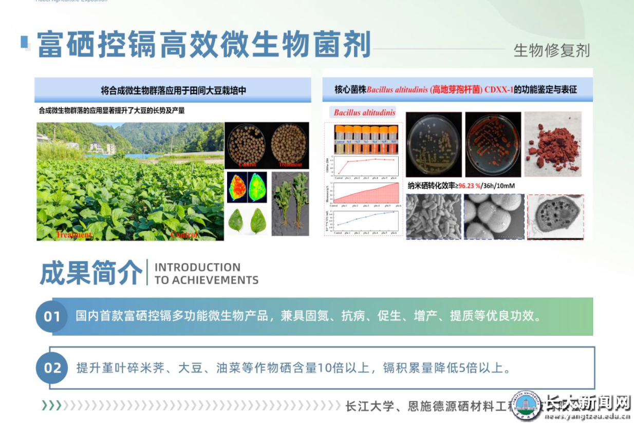 农博会上,我校重点展示了“富硒控镉高效微生物菌剂”“‘稻+鸭+蛙’绿色高效生态种养模式”2项科研成果。
