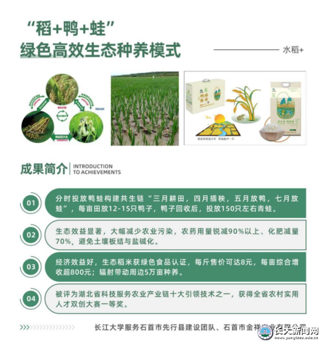 “‘稻+鸭+蛙’绿色高效生态种养模式” 通过构建“稻鸭共育、稻蛙共生”的立体循环系统,利用鸭、蛙实现田间除草、捕虫、施肥等生态功能,大幅减少化肥农药投入,不仅有效改善了农田生态环境,提升了稻米品质与安全水平,更通过“一地多收”显著提高了单位面积的经济效益。