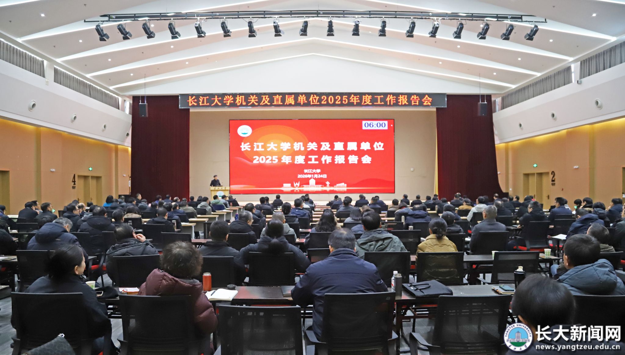 新闻网讯(记者 晏亮/文 李胜杰/摄)1月24日,学校举行机关及直属单位2025年度工作报告会。全体校领导、机关及直属单位中层干部、学院(部)中层正职干部参会,共同听取机关及直属单位工作汇报,总结2025年亮眼成绩,谋划2026年重点工作。
