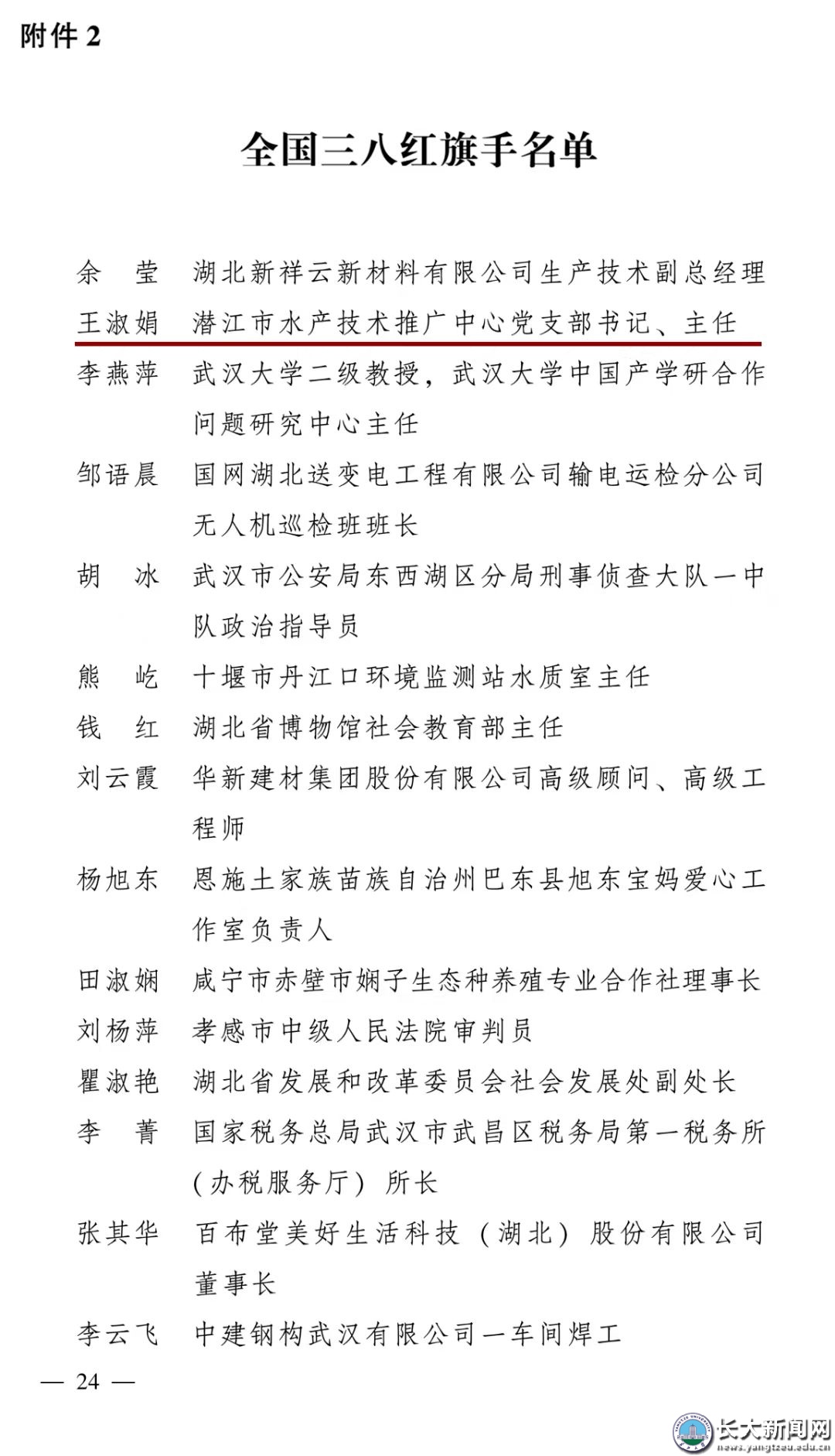 新闻网讯 3月2日,全国妇联在北京举行纪念“三八”国际妇女节暨表彰大会。大会授予9人全国三八红旗手标兵称号,表彰598名全国三八红旗手。我校87级水产专业校友、潜江市水产技术推广中心党支部书记、主任王淑娟荣获全国三八红旗手称号。