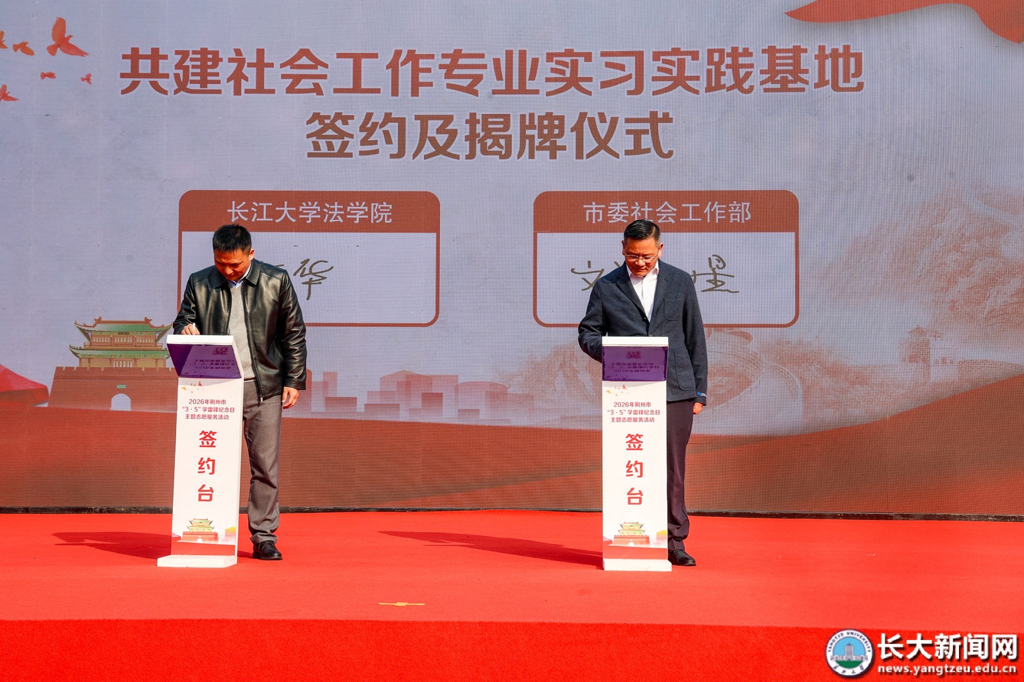 仪式现场,法学院院长李华成与荆州市委社会工作部部长刘红星代表双方签署共建社会工作专业实习实践基地协议,并共同为“社会工作专业实习实践基地”揭牌。该基地的正式揭牌,标志着双方此次合作迎来实质性进展,也标志着校地协同培育高层次社工人才、助力基层治理现代化的合作从蓝图走向实践。