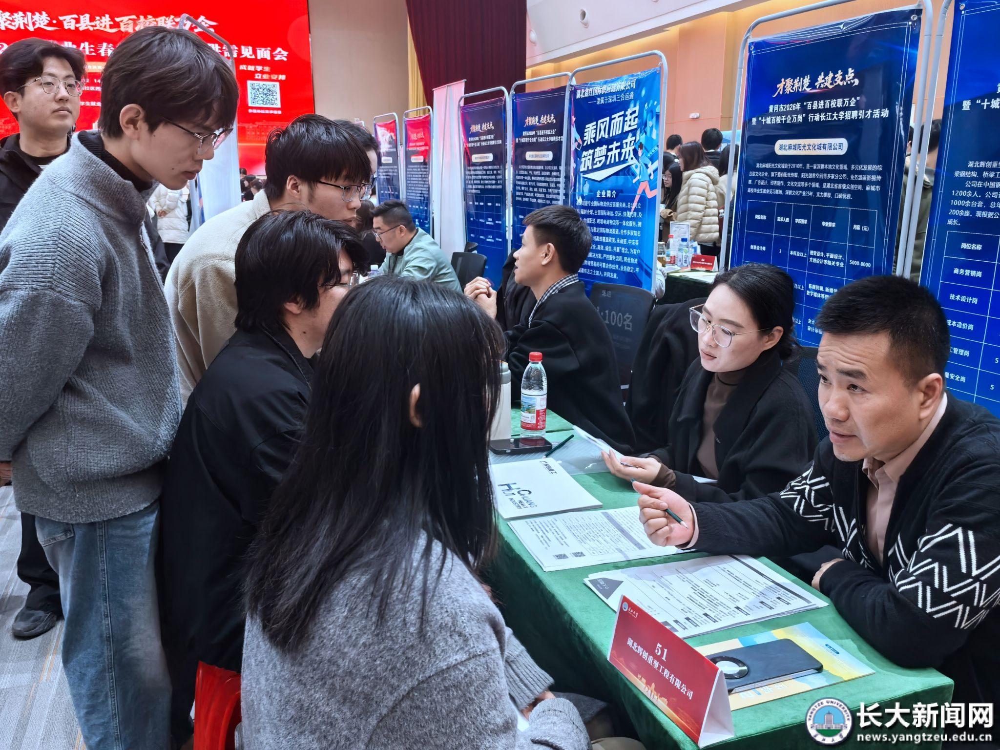 下午两点半,招聘会现场已是热闹非凡。毕业生手持简历有序穿梭于企业展位之间,主动与用人单位代表交流,积极展示专业能力与综合素养。来自能源动力、智能制造、生物医药、教育培训、金融商贸、文化传媒、现代农业等多个领域的用人单位代表们热情地介绍各自单位的文化、优势和岗位要求,互动频繁。活动现场还单独设立黄冈市招聘专区。