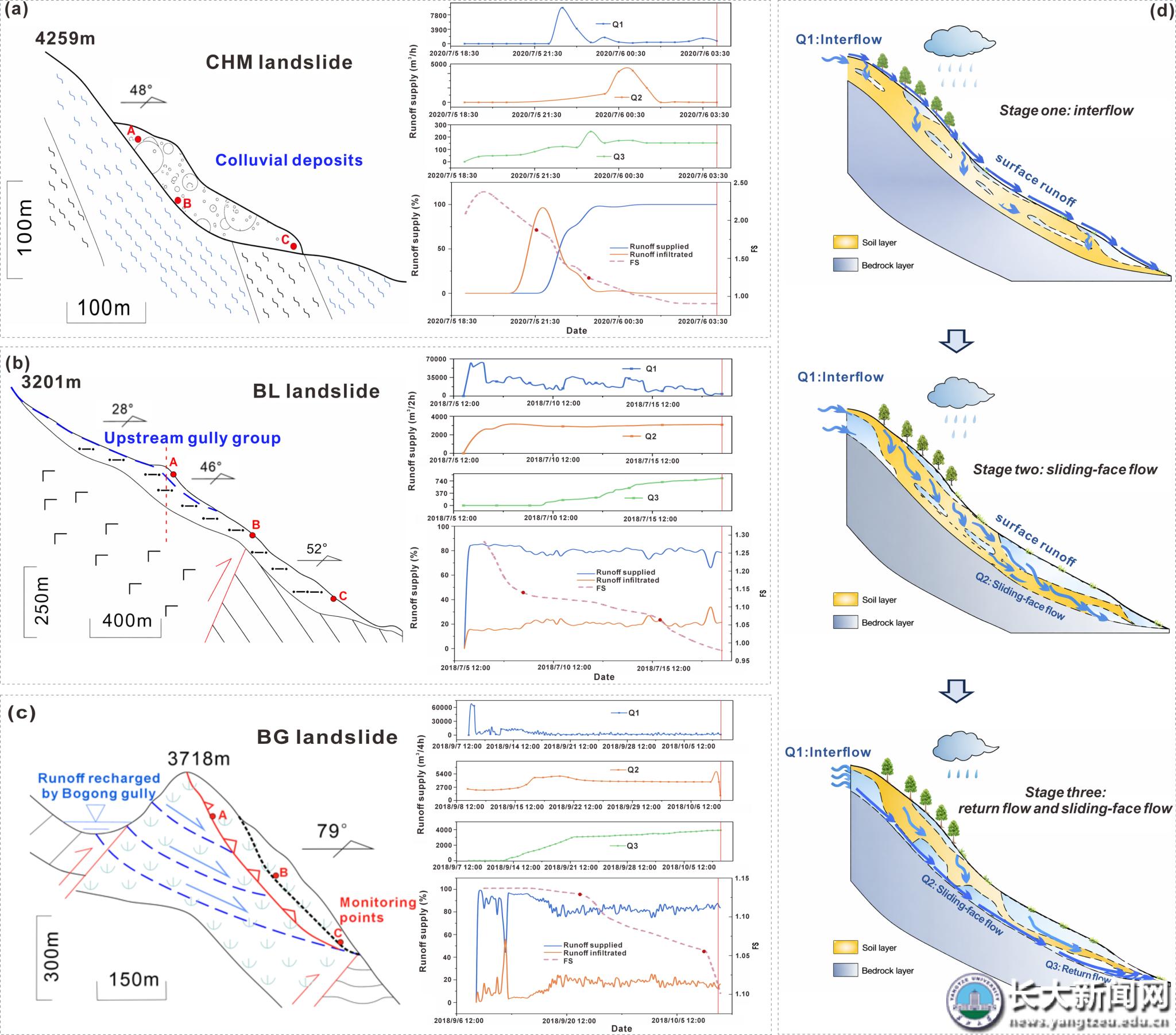 该研究表明,此类滑坡实则受控于早期降雨的滞后效应。早期降雨通过三种径流供应模式(坡面、沟槽和径流供给),以及两个迁移阶段(表面流和地下流),滞后补给到滑面,进而导致滑坡发生时间的滞后。