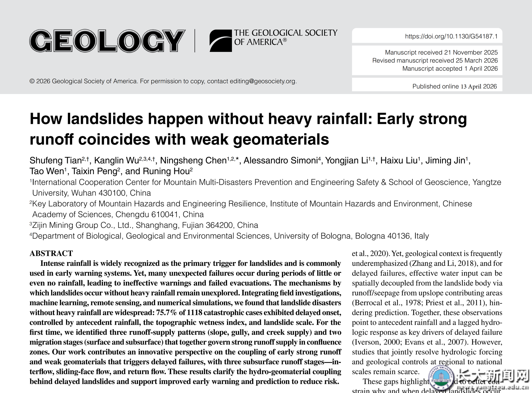 新闻网讯(通讯员 温韬)近日,地球科学学院陈宁生教授团队以我校为第一署名单位,在地质学顶级NI指数期刊《Geology》上发表题为“How landslides happen without heavy rainfall: Early strong runoff coincides with weak geomaterials”的文章,揭示滑坡的强水弱岩土机制,分析许多灾害性滑坡发生在无雨或小雨时期的原因。