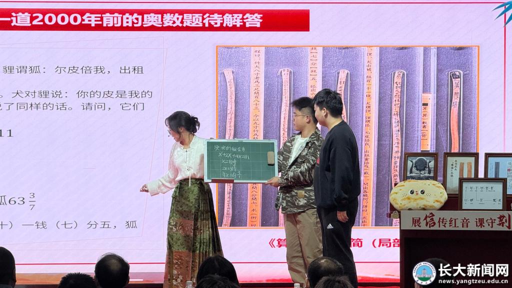 “狐、貍、犬出关,租百一十一钱……”课程互动环节,物理与光电学院胡潇文同学现场解题,用现代数学破解西汉算术简中的难题,引来阵阵掌声。