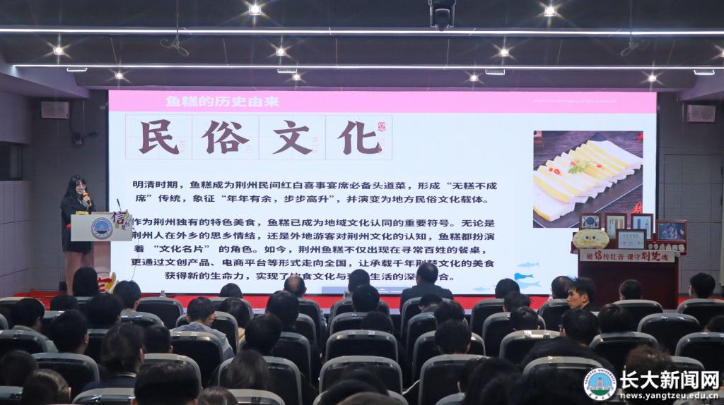 如何让古老文化“活”在当下?牟菲以荆州鱼糕、锅盔等特色食品为例,讲述文创设计如何助力荆楚文化“破圈”传播,激发学生浓厚兴趣。