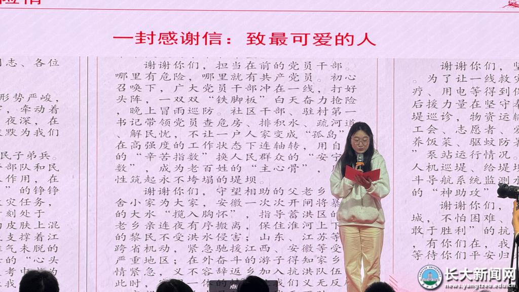 “谢谢你们,闻汛而动的人民子弟兵……”书信品读环节,法学院王羿茹同学深情诵读了一封感谢信,向闻汛而动的子弟兵、担当在前的党员干部、守望相助的父老乡亲和坚守奉献的“后勤兵”致敬。字里行间流露的“舍小家为大家”的担当与情怀,深深打动了在场师生。