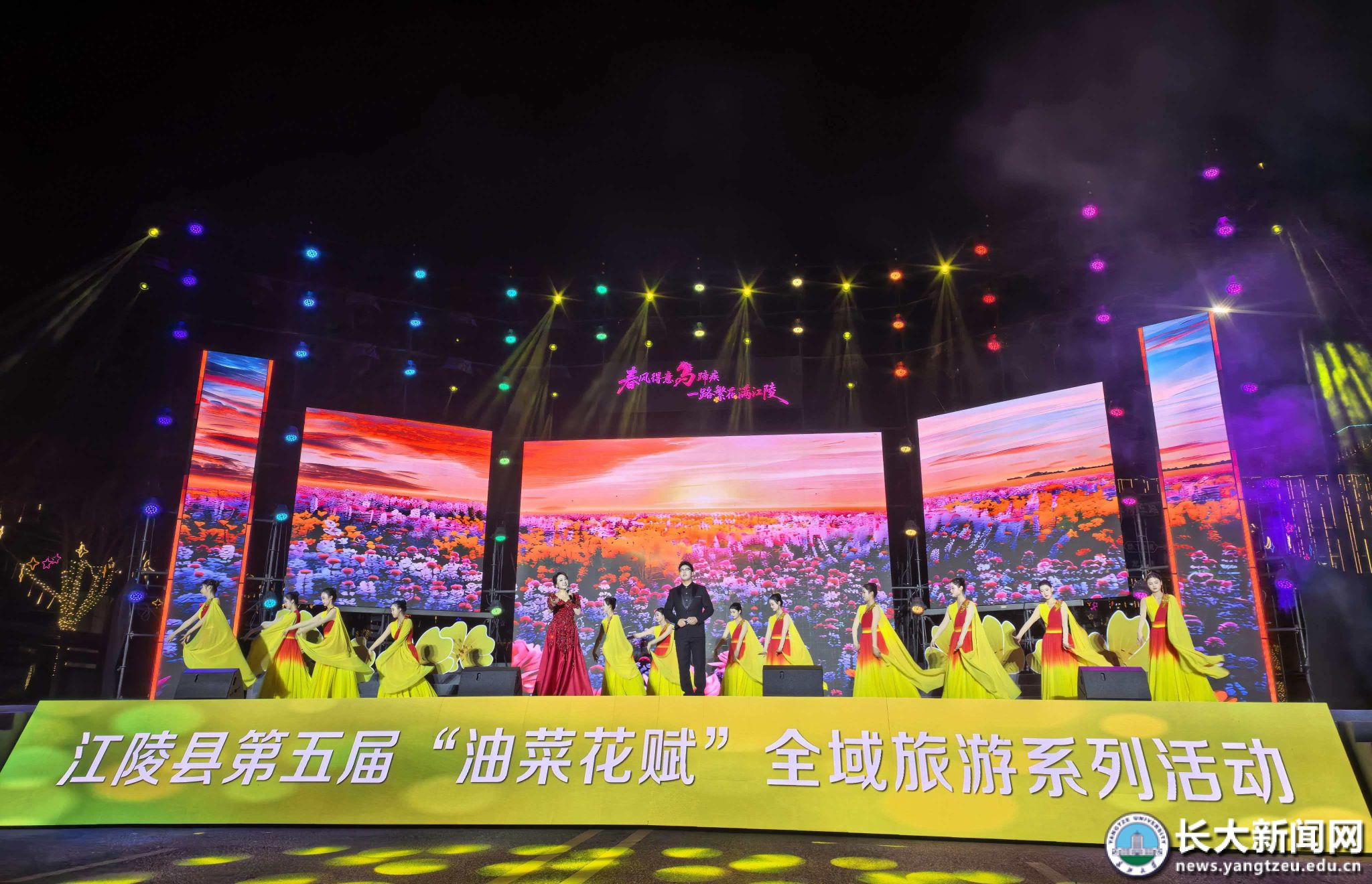 新闻网讯 油菜花开遍地金。3月13日,江陵县第五届“油菜花赋”全域旅游系列活动开幕。艺术学院作为协办单位,在开幕式上奉献了精彩的文艺节目,用艺术之美赋能乡村振兴。