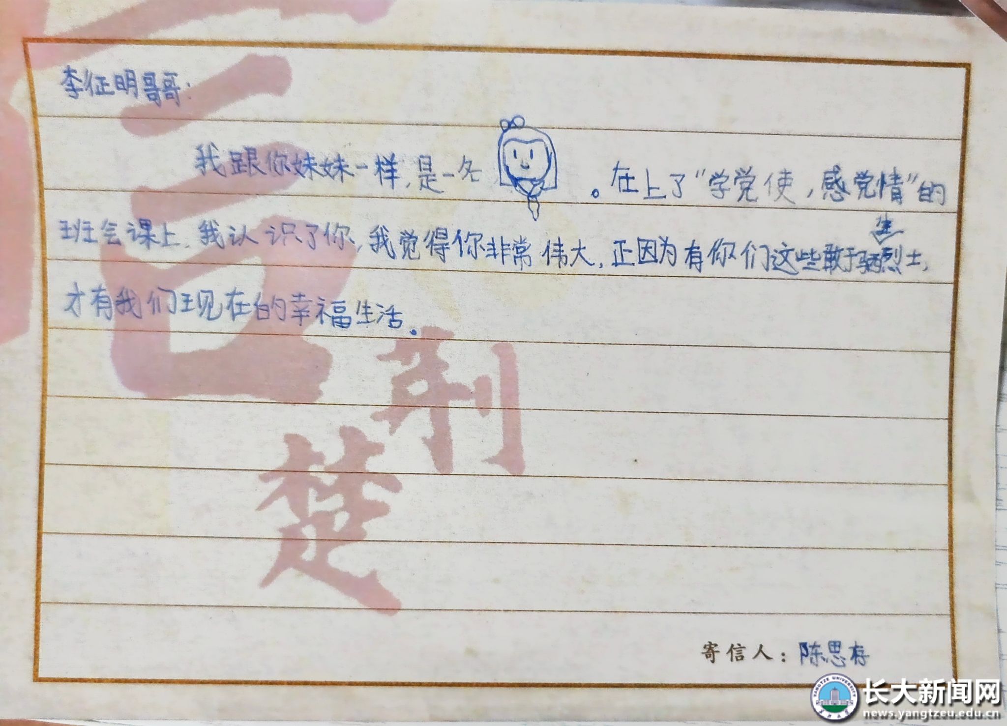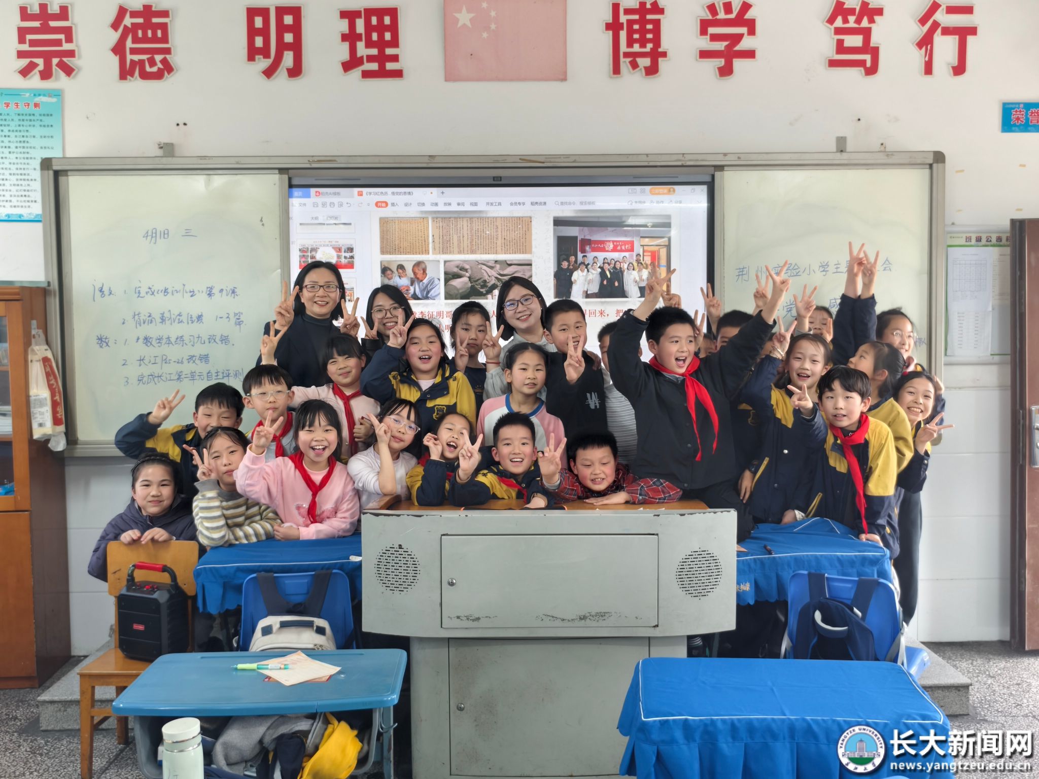课后,孩子们围在讲台前叽叽喳喳地讨论着。“李征明哥哥真伟大,我也要努力学习,长大后像他一样守护祖国!”陈思存同学握着小拳头激动地说。李阳泽同学也凑过来,“小袁老师谢谢你,这堂班会课真有意思,你下次还能来给我们讲课吗?我长大后也想上长江大学。”天真稚嫩的话语是最真实的课堂反馈,一封“表情包”家书在孩子们心中悄然种下一颗颗红色的种子。